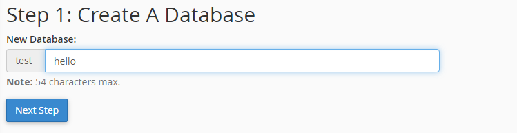 سپس در مرحله یک که Create A Database عنوان دارد، نام دیتابیس خود را وارد کنید برای مثال ما نام hello را وارد کردیم. بعد بر روی دکمه next step کلیک کنید.