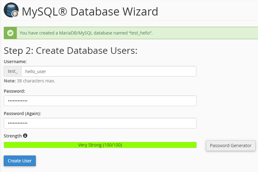 حال در مرحله دو هستیم و باید یوزر و پسورد خود را بسازیم ما برای یوزر hello_user و برای پسورد هم ;p[t.Syrm_oV را وارد کردیم حالا بر روی Create User کلیک کنید.