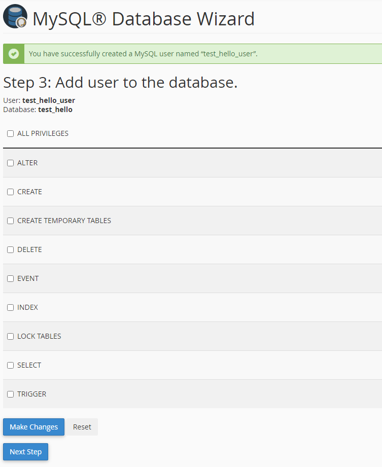 حال تیک ALL PRIVILEGES را بزنید و بر روی دکمه Make Changes کلیک کنید.