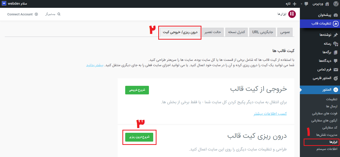 سپس از طریق "المنتور > ابزار ها" می خواهیم فایل های دمو را درون ریزی کنیم. حال بر روی دکمه "شروع درون ریزی" کلیک کنید و فایل elementor-kit.zip که در پوشه 5. Dummy data موجود می باشد را درون ریزی کنید.
