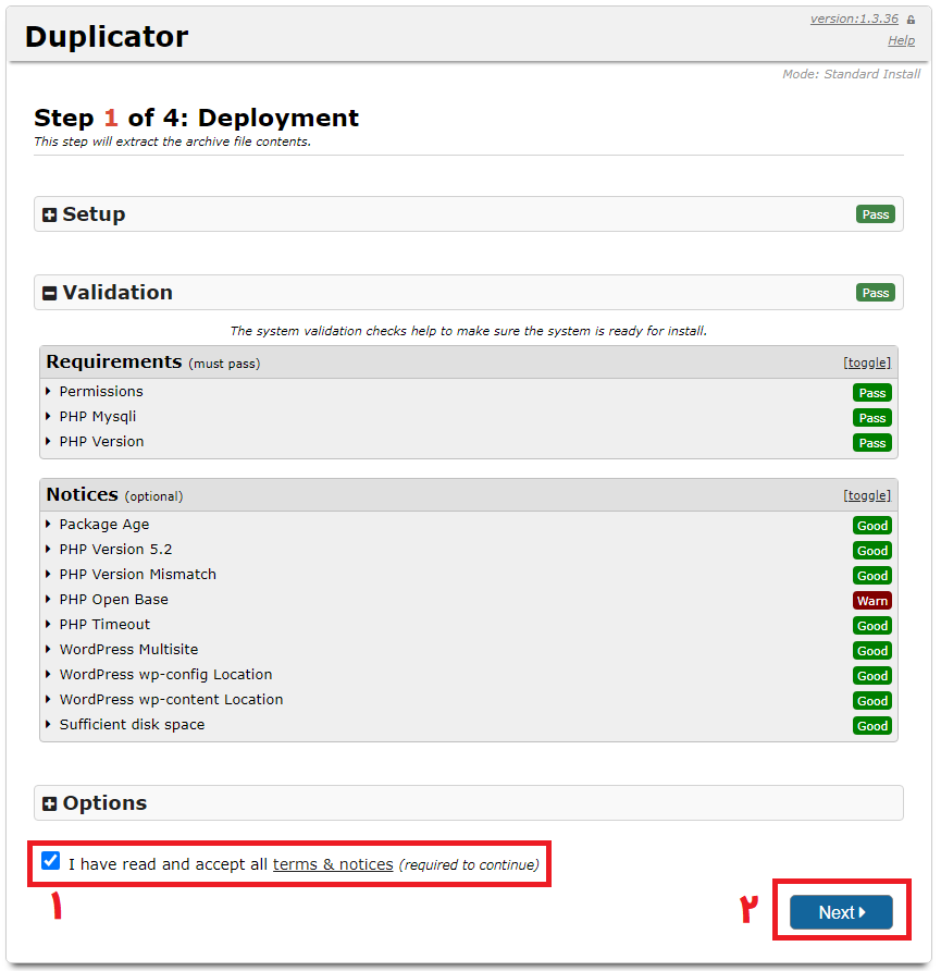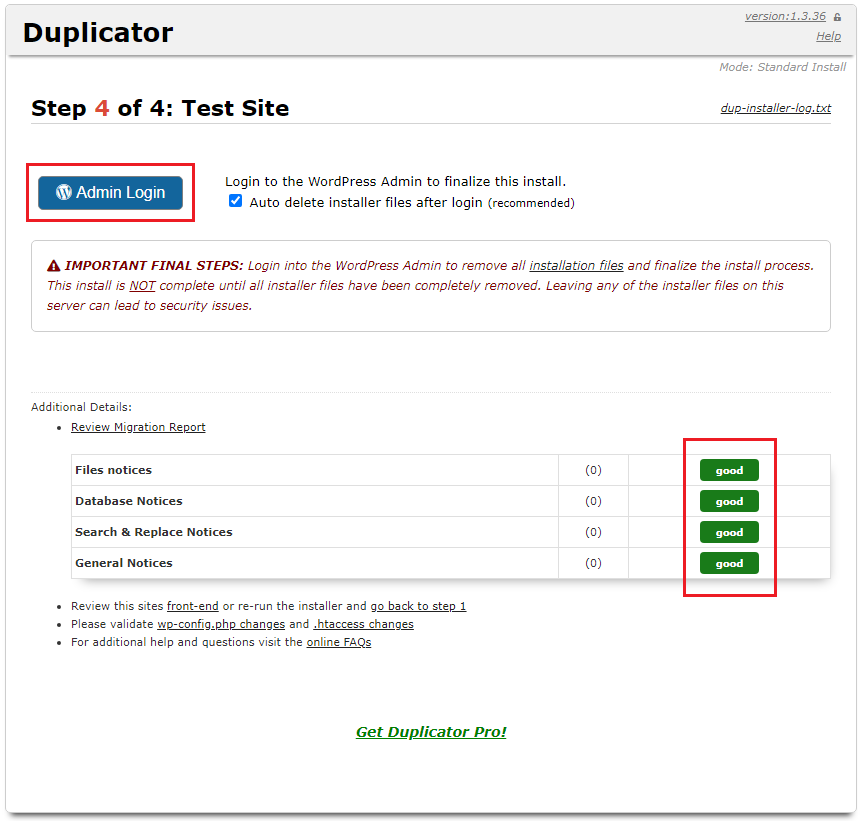 مرحله چهارم - پایان تبریک! قالب با موفقیت نصب شد. لطفا توجه داشته باشید اگر هر چهار موارد زیر به خصوص دوتای اولی به رنگ سبز بودند یعنی قالب بدون هیچ ایرادی نصب شده است. از طریق دکمه Admin Login نیز می توانید وارد داشبورد مدیریتی وردپرس خود شوید.