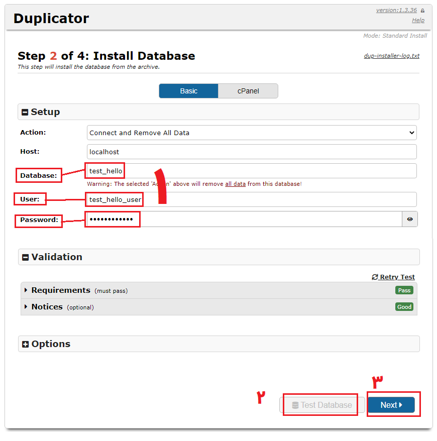 مرحله دوم: دیتابیس، یوزر و پسوردی که باهم ساختیم را وارد می کنیم. سپس روی دکمه Test Database کلیک کرده و بعد بر روی دکمه Next کلیک می کنیم. در پنجره باز شده نیز OK را می زنیم.
