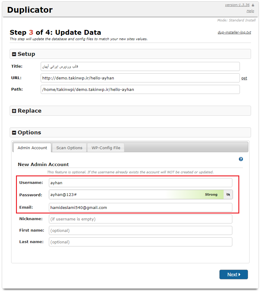 مرحله سوم: یوزر و پسورد خود را جهت ورود به داشبورد وردپرس بسازید. سپس بر روی دکمه Next کلیک کنید.