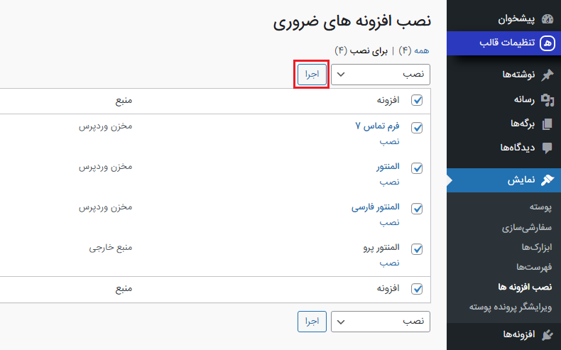 در صفحه باز شده تیک افزونه را بزنید تا تمامی افزونه ها انتخاب شوند، سپس از کار های دسته جمعی نصب را انتخاب کرده و بر روی دکمه اجرا کلیک کنید تا افزونه ها نصب شوند.